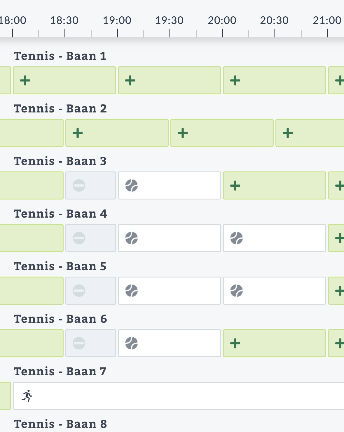 - Na afloop van een reservering mag worden doorgespeeld, zolang de baan niet aansluitend is gereserveerd. Zodra er een reservering start, moet de baan direct worden vrijgemaakt.