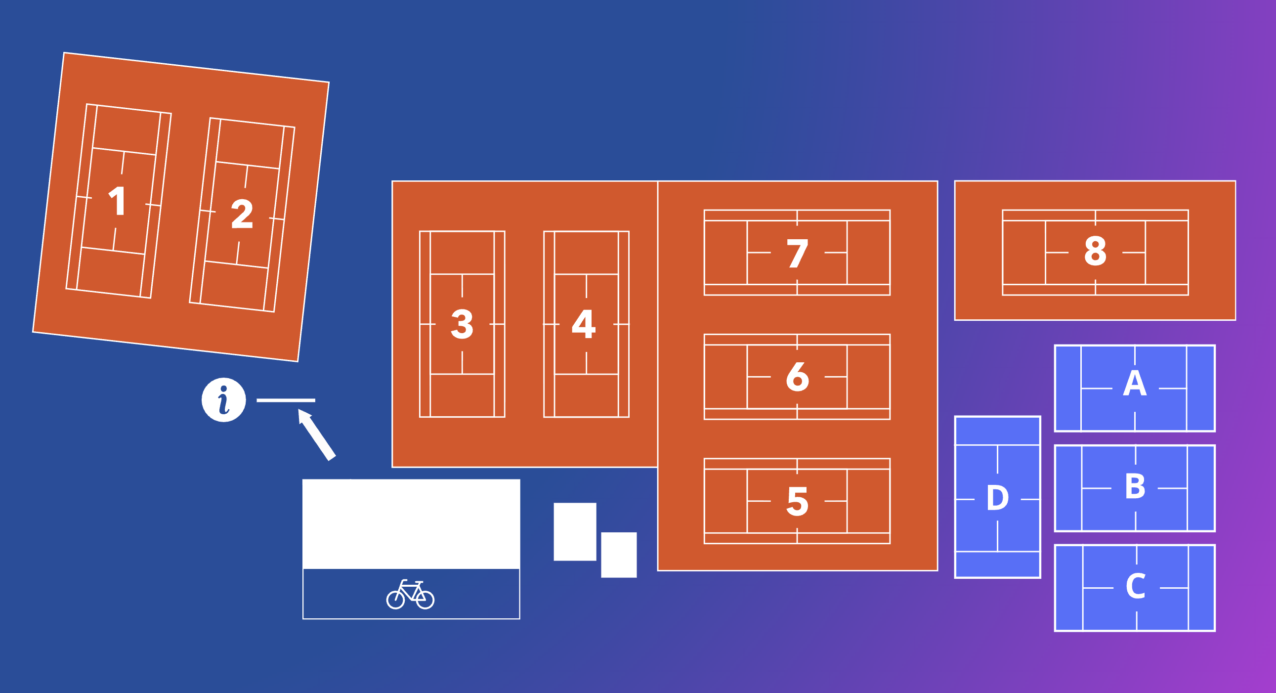Banen 3-8 en A-D zijn voorzien van verlichting, banen A en B hebben een overkapping.